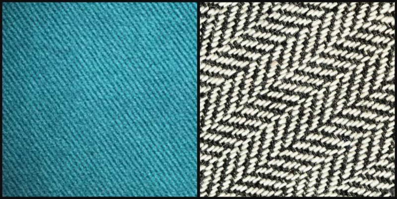 Twill is a type of weave that produces a pattern of diagonal parallel ribs or lines (think herringbone). This is done by passing the weft thread over one or more warp threads and then under two or more warp threads. Examples of twill are denim, chino, gabardine and tweed.