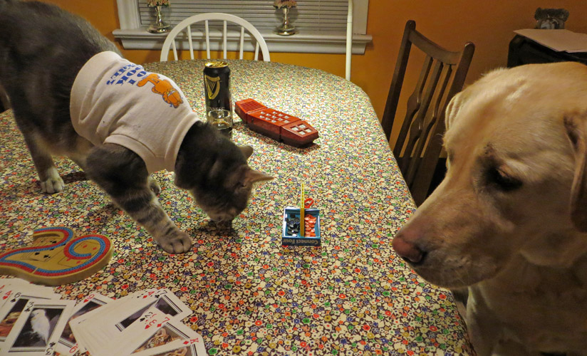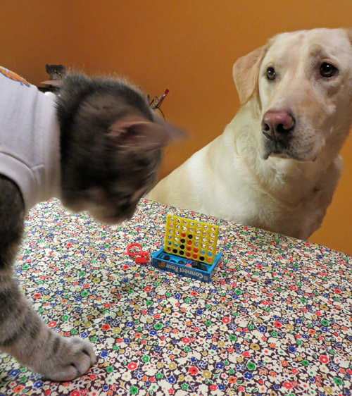 My Turn. Hmmmmm…… (Kitty’s Garfield shirt says “Do I Look Like I Care?” Strategic dressing to help psych out his opponent)