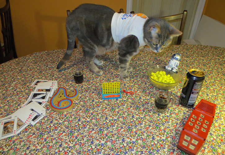 Kitty decided to combine Game Night with the winning entrant selection. He often has guests over for some board games and cards, where he’ll kick back, put on a casual tee and pour some Guinness. Tonight’s featured game is Mini Connect Four!